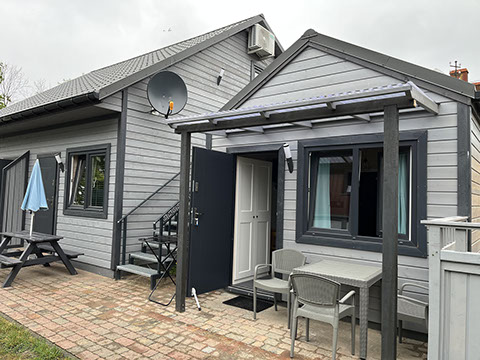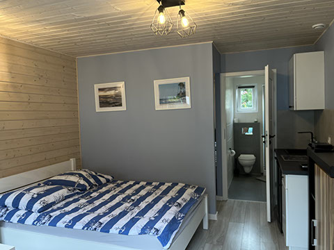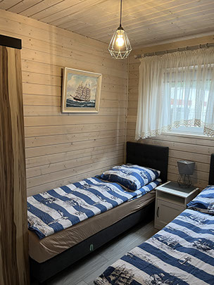 domki letniskowe 4,5 os. W których znajduje się salon z TV z aneksem kuchennym w pełni wyposażony (lodówka, kuchenka, sztućce, talerze, garczek, patelnia, czajnik) oraz mała sypialnia dla dzieci, przed każdym domkiem znajdują się ławki do posiedzenia na powietrzu.