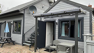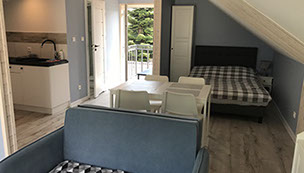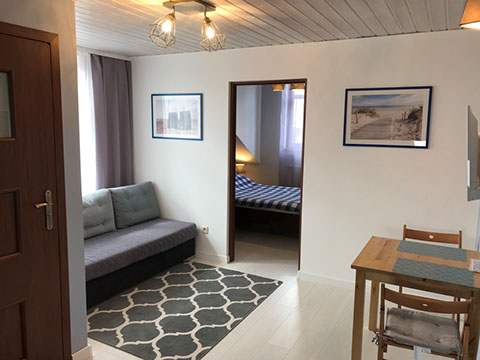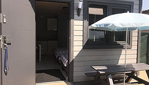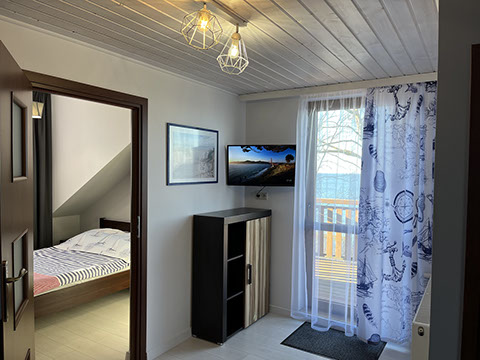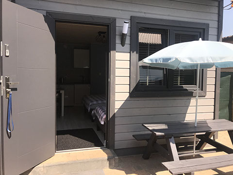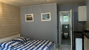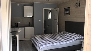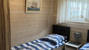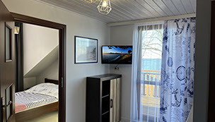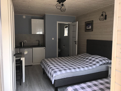 domki letniskowe 4,5 os. W których znajduje się salon z TV z aneksem kuchennym w pełni wyposażony (lodówka, kuchenka, sztućce, talerze, garczek, patelnia, czajnik) oraz mała sypialnia dla dzieci, przed każdym domkiem znajdują się ławki do posiedzenia na powietrzu.